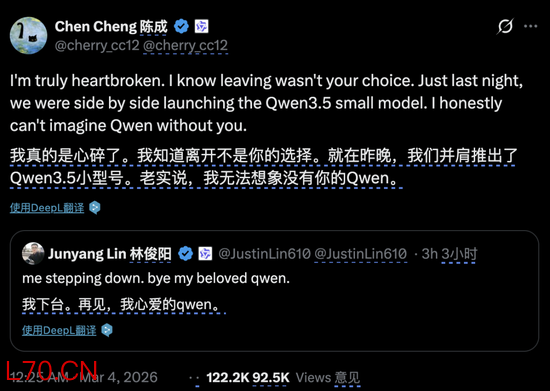 林俊旸的离开引发了 AI 圈大量讨论,多位他的同事和 AI 从业者在社交媒体上表达惋惜与感谢。