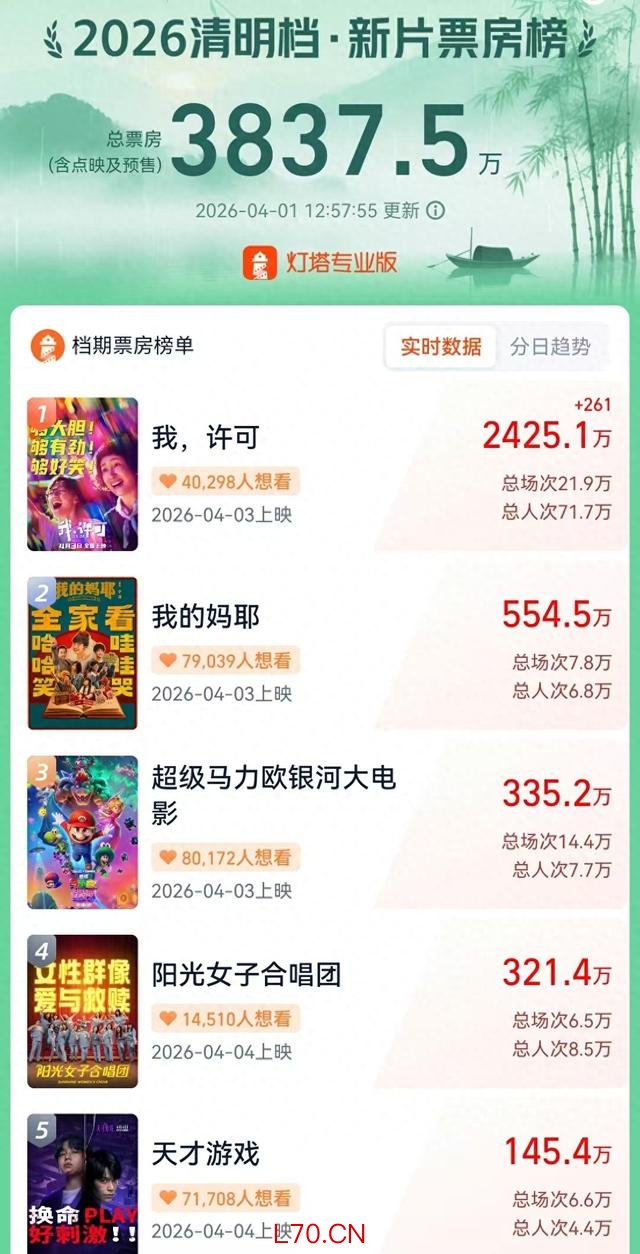 清明将至,今年电影清明档将史无前例地上映19部新片。平台数据显示,目前(1日中午)清明档新片点映及预售总票房已突破3800万元,影片《我,许可》《我的妈耶》《超级马力欧银河大电影》《阳光女子合唱团》《天才游戏》暂列点映及预售票房榜前五。