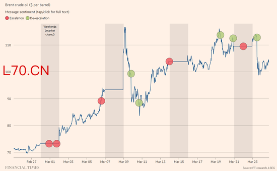 布伦特原油在3月9日触及每桶119美元上方的高点,并在过去几周剧烈震荡,因伊朗对穿越霍尔木兹海峡的船只以及海湾地区的能源设施发动了打击。