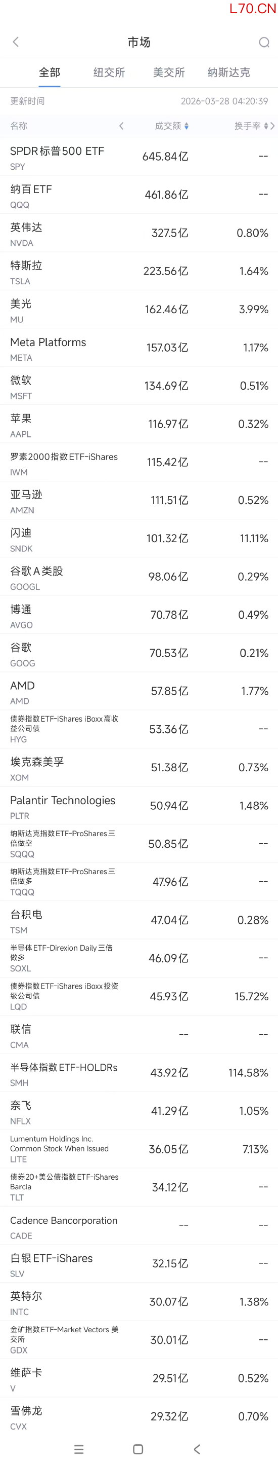 第3名美光收高0.5%,成交162.46亿美元。该股本周累计下跌超过15.5%。谷歌发布的TurboQuant的新技术令存储科技股普遍承压。