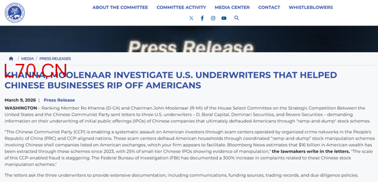 该委员会的首席成员罗·卡纳(加州民主党)和主席约翰·穆勒纳尔(密歇根州共和党)致函三家美国承销商——D. Boral Capital、Dominari Securities和Revere Securities——要求它们提供有关其承销中概股首次公开募股(IPO)的信息。消息称,这些IPO最终通过“拉高出货”的“杀猪盘”手段欺骗了美国投资者,卷走大量金钱。
