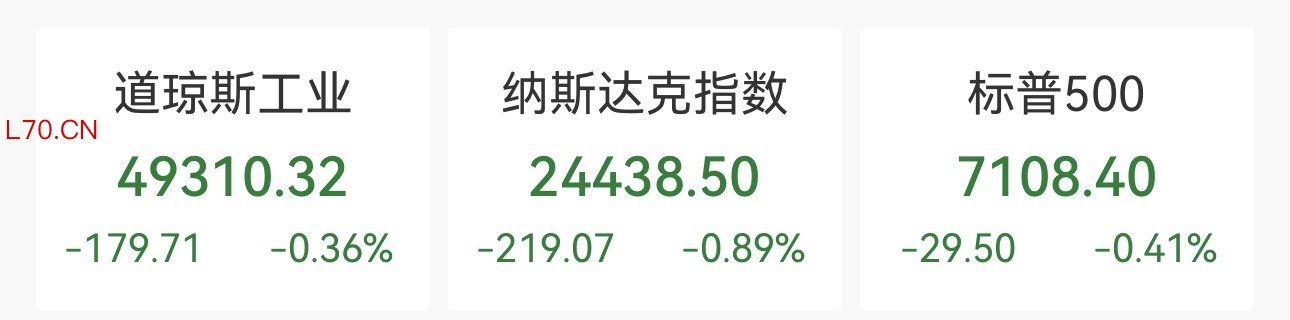 截至收盘,道琼斯工业平均指数跌179.71点,跌幅0.36%,报49310.32点;纳指跌219.06点,跌幅0.89%,报24438.50点;标准普尔500指数跌29.50点,跌幅0.41%,报7108.40点。